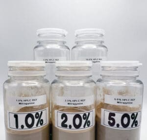 Next, any analytical method to test for alkaloid content must begin with reference samples from a reputable chemical supply house. Our preferred supply house is Sigma-Aldrich. They provide both Mitragynine and 7OH samples with 100% purity. This allows us to calibrate our machines to pinpoint accuracy with precisely measured dilutions made from each original pure sample. We calculate all formulations and dilutions to the thousandth to ensure that any whole number results are as scientifically accurate as possible.